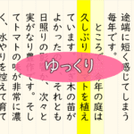 縦書きのノートの余白をさわると,その列が黄色にハイライトされます。少し時間をおいて元の色に戻るため,ハイライトをON/OFFする手間はいりません。02055[国語]ハイライトノート 28ptが7秒でしたが,この教材は10秒かかるゆっくりバージョンです。自分で使って読む箇所をはっきりさせたり,支援者が操作できる原稿としてタブレットに入れて使ったり,使い方次第でいろいろと活用できます。