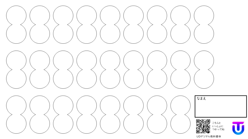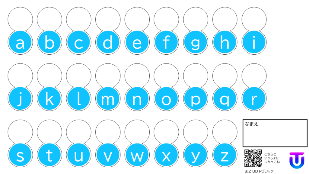 ワークシートのPDFです。全表示,大文字のみ表示,小文字のみ表示,ランダム表示,全非表示と,6種類バージョンがあります。必要に応じてお使いください。また,フォント別に2種類作りました。本教材と対応しているWebアプリ[W067[WAPP]アルファベットの大文字小文字をくっつけて]は「BIZ UDPゴシック」を採用しています。