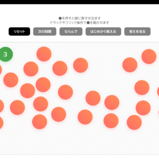 画面に広がる●の数を数える教材です。オレンジの丸を押すと,数えた順に数字が表示されます。各種ボタンについて,最初の画面でスライダーで●の数の上限値を決めます。学習習熟度に合わせて調整してください。その後,「●はいくつ?スタート」のボタンを押...