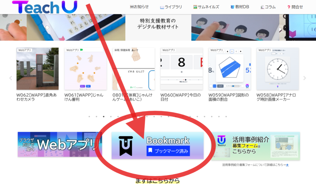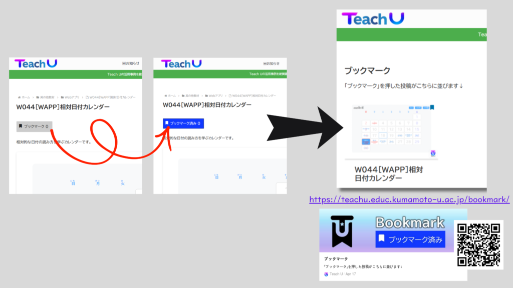 ②ブックマークのページ(https://teachu.educ.kumamoto-u.ac.jp/bookmark/)に,ブックマークされたデジタル教材が保存されます。よく使うデジタル教材をブックマークしておくと,ブックマークのページに並んで表示されるため,再度使う場合に便利です。