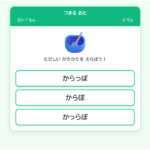 つまる音(促音)について「ふりカエル🐸」「たしカメる🐢」アプリです。3択から正しいものを10問選んでいきます。問題の種類は全部で33種類あり,ランダムに10問選ばれます。1問10点,全問正解で100点満点です。10問回答が終わったら,正答か…
